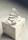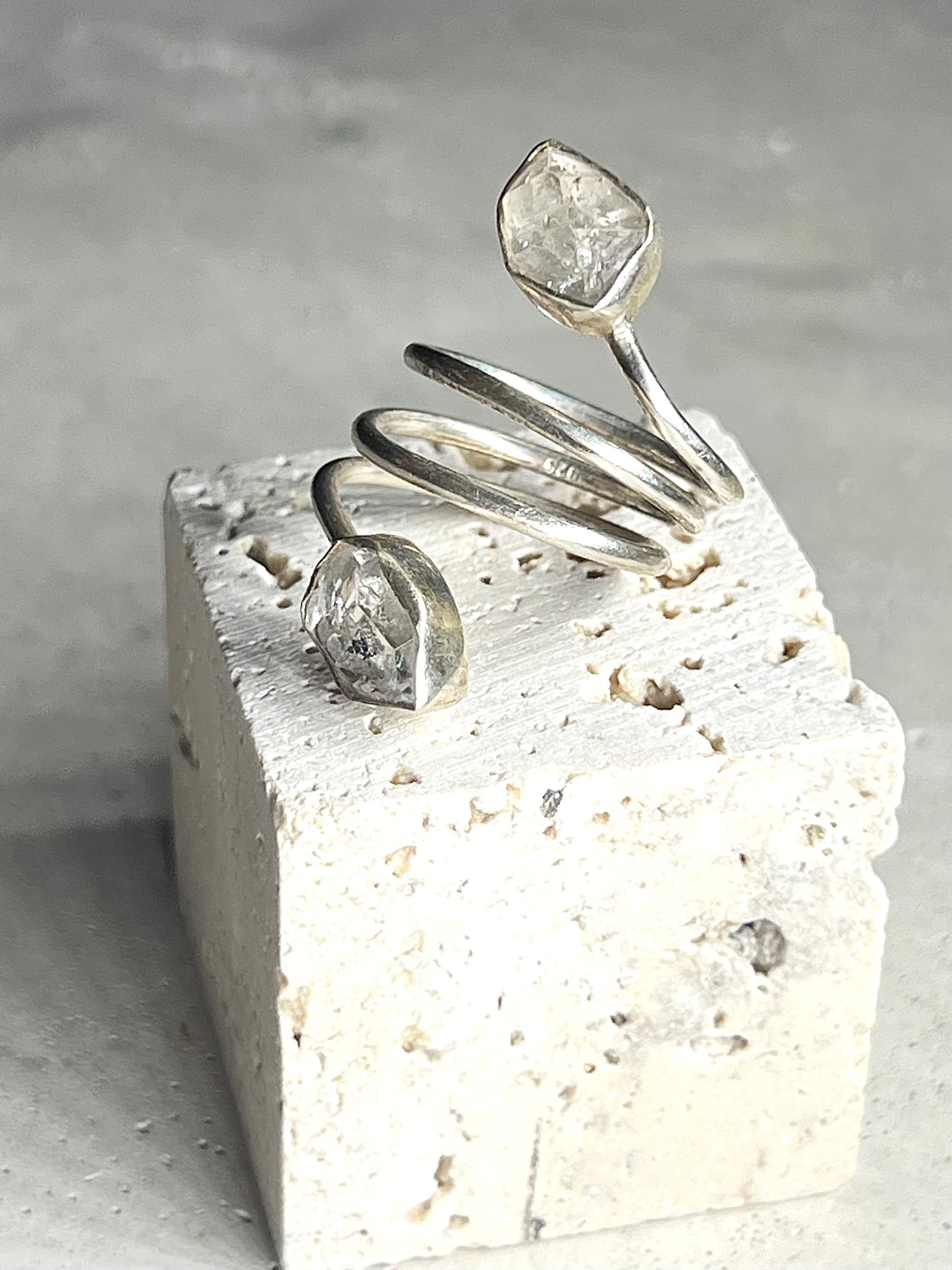 Echtsilber Ring mit zwei Herikmer Diamanten. Die gesamte Ringfassung ist aus 925 recycled Silber angefertigt. Die zwei rohen Herikmer Diamanten sind in freier Form an die Silberfassung adaptiert und eingearbeitet worden.