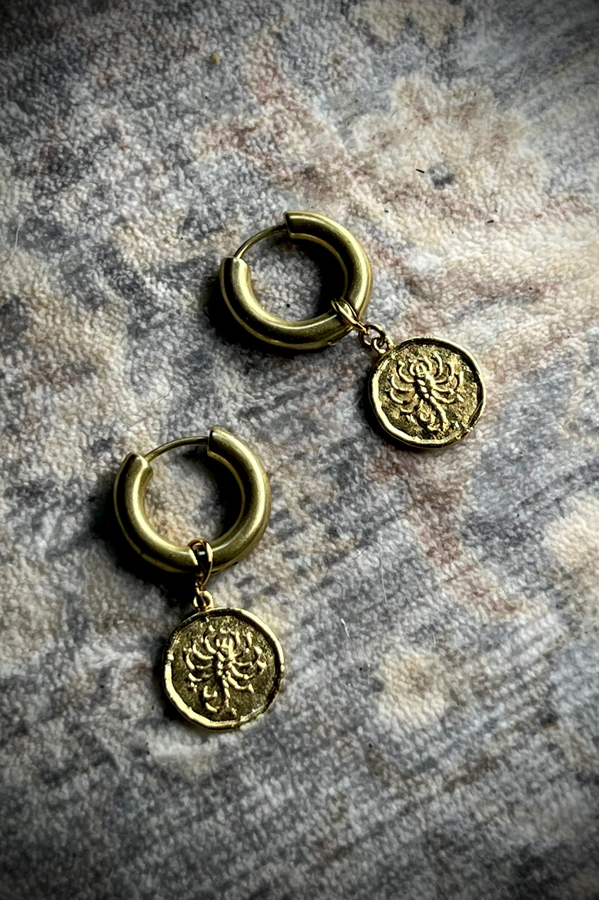 Massive Creolen in 4mm Stärke aus hochwertigem Messing und mit Skorpion Sternzeichen / Scorpio Zodiac Sign Prägung in Talerform.