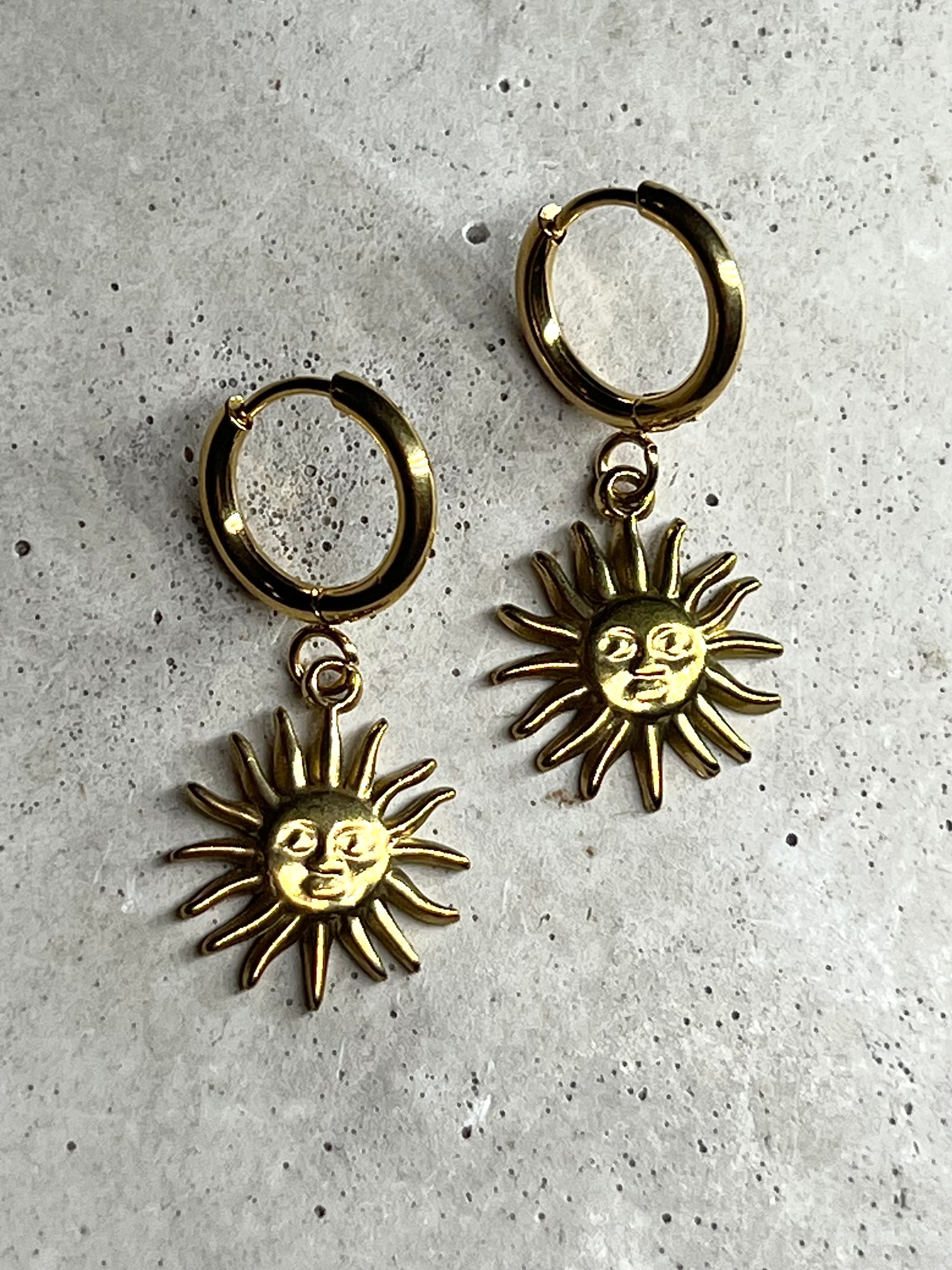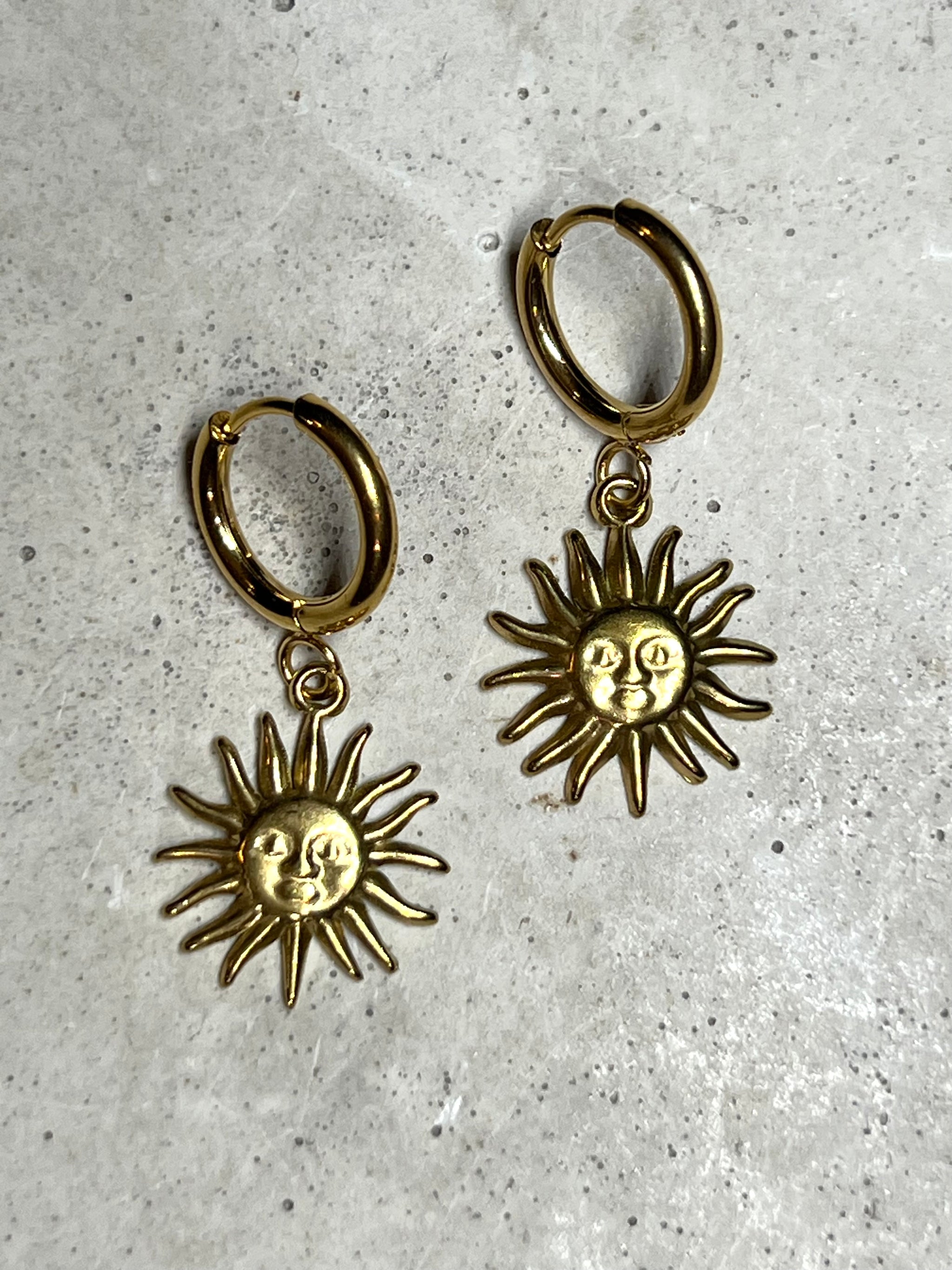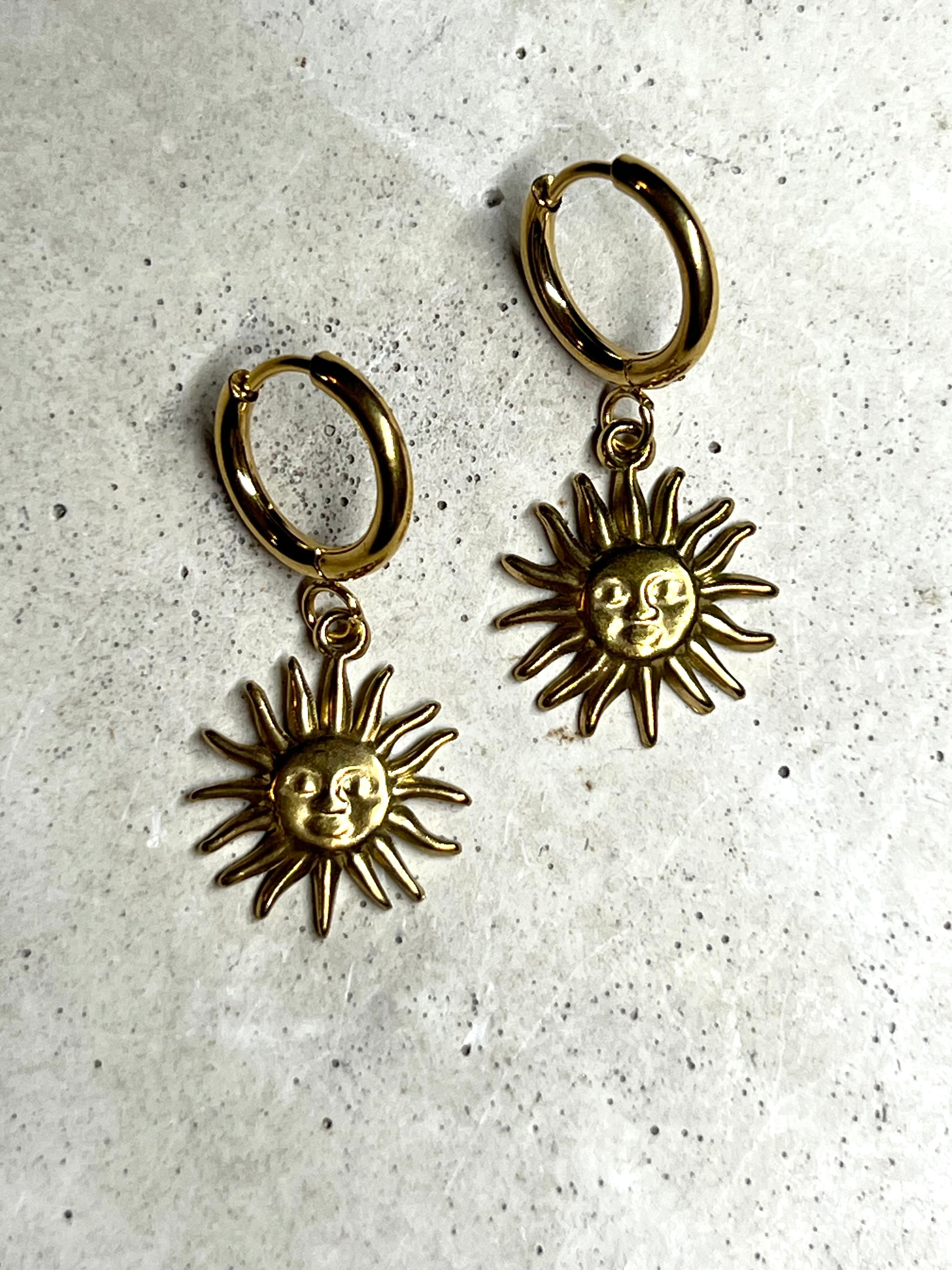Sonnen in 1cm Durchmesser an 2cm dicken massiven Creolen. Alle Elemente sind aus Edelstahl gefertigt und zu 18k vergoldet.