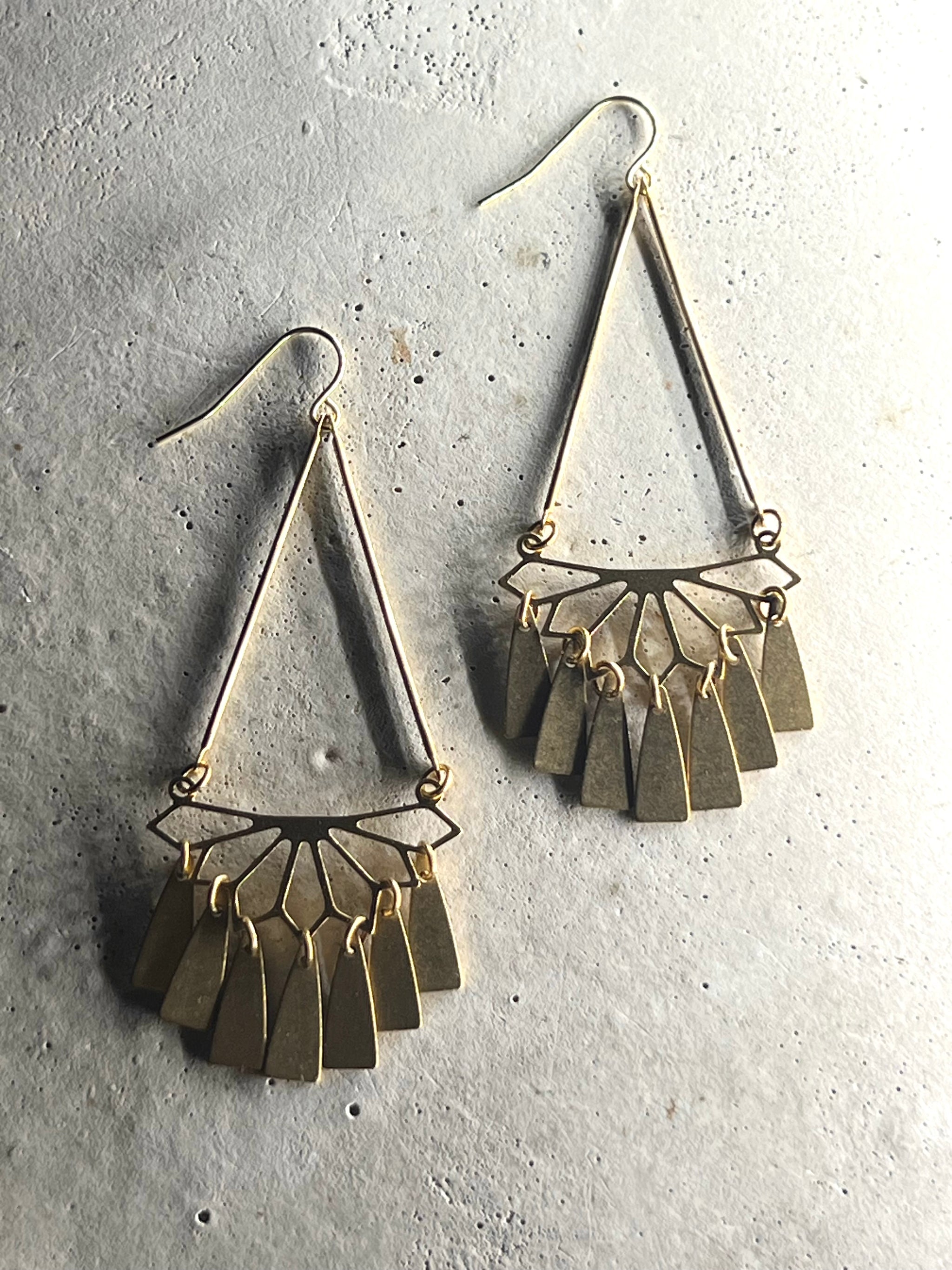 Lange & leichte Boho / hippiesque Ohrringe mit filigranem Anhänger und einer Marquise aus kleinen, schmalen Dreiecken. Die Ohrringe sind aus hochwertigem, nickel-, cadmium- sowie bleifreiem Messing angfertigt. Die Ohrhaken bestehen aus 925 recycling Silber und sind zu 14k vergoldet. Die Ohrringe sind für ihre Länge sehr leichtgewichtig.