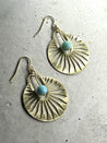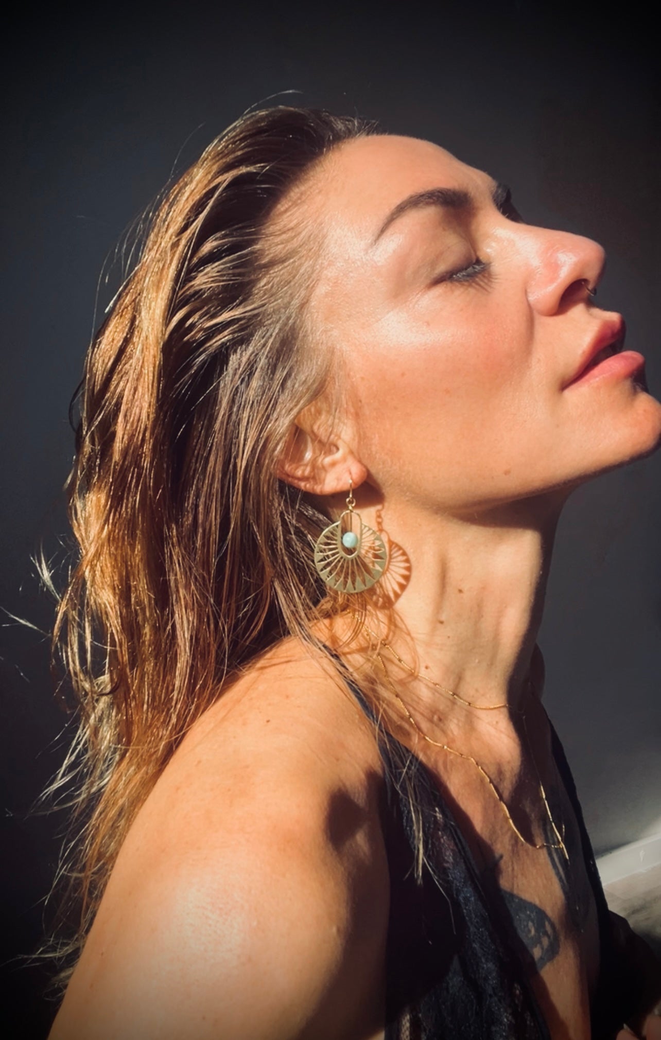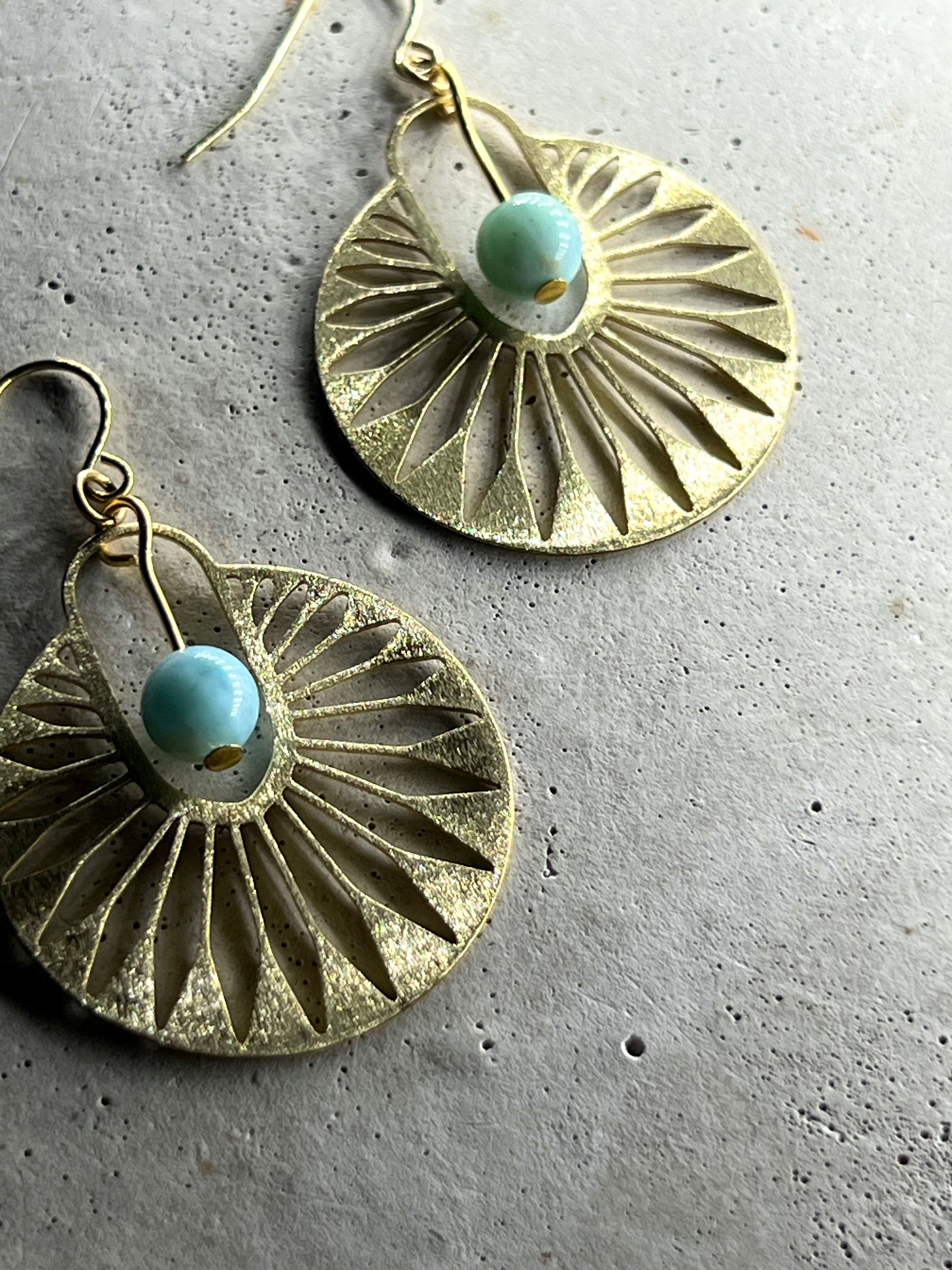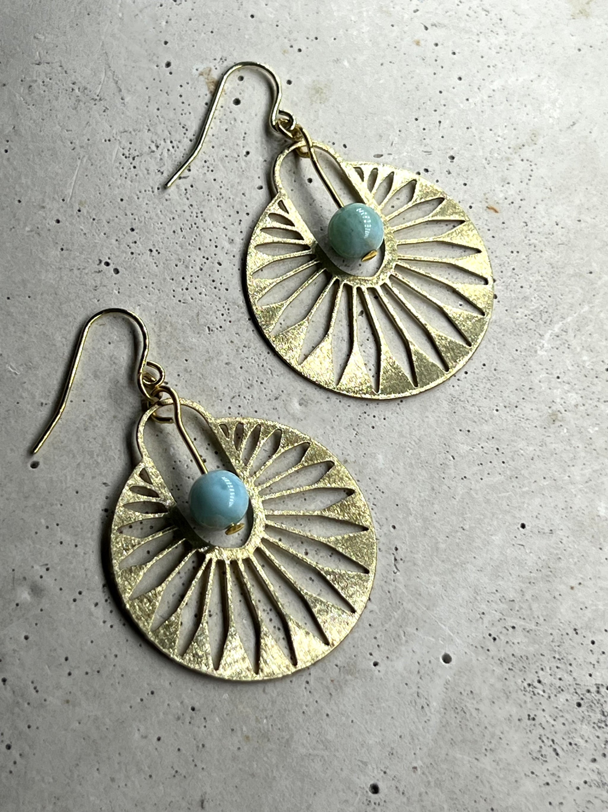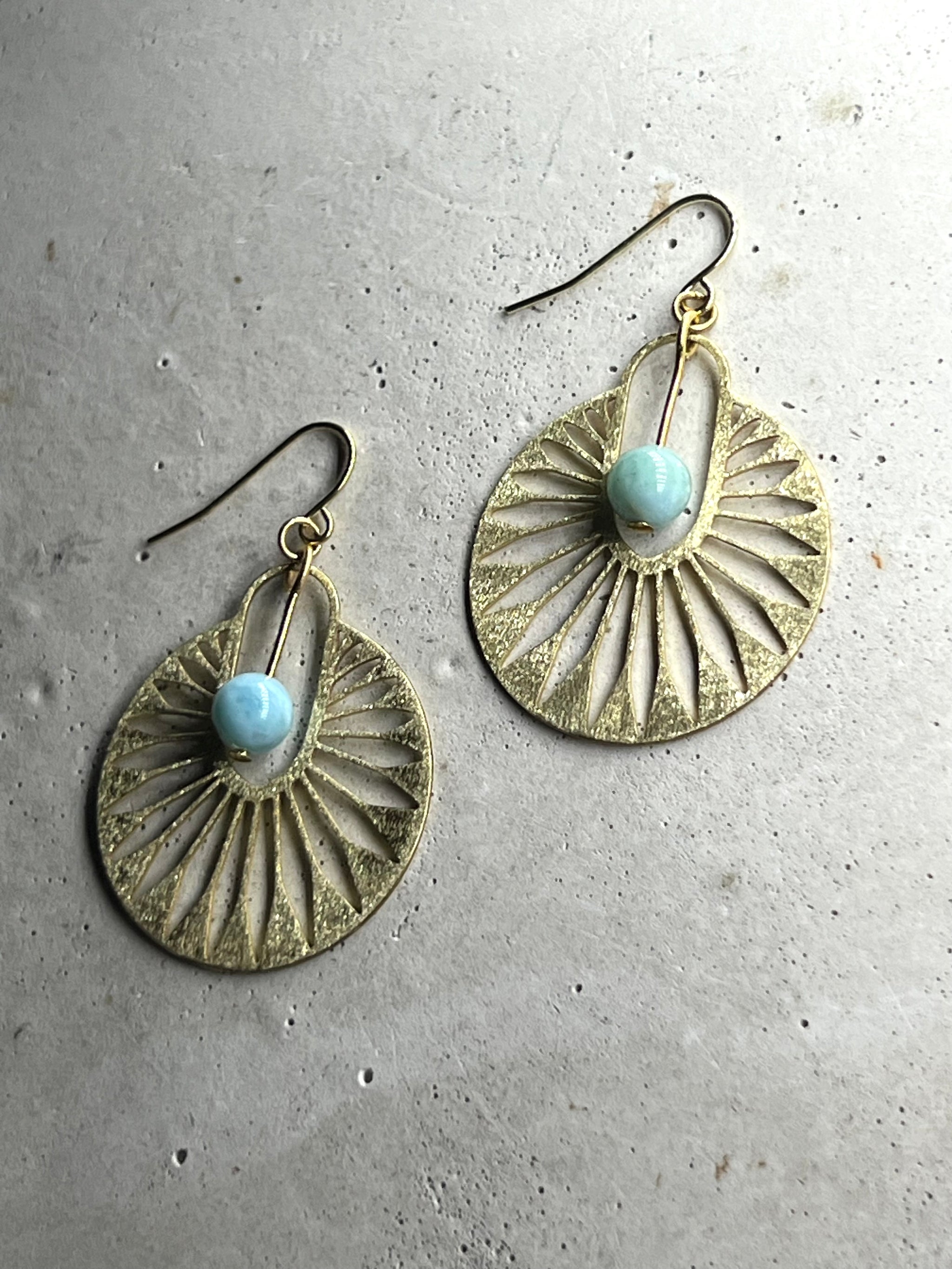 Filigrane Kreiselemente wie von Sonnenstrahlen umgeben, aus welchen jeweils tief blau-türkise Larimar Edelstein Spheren hervorscheinen. Die Ohrhaken bestehen aus 925 recycled Silber zu 14k vergoldet.
