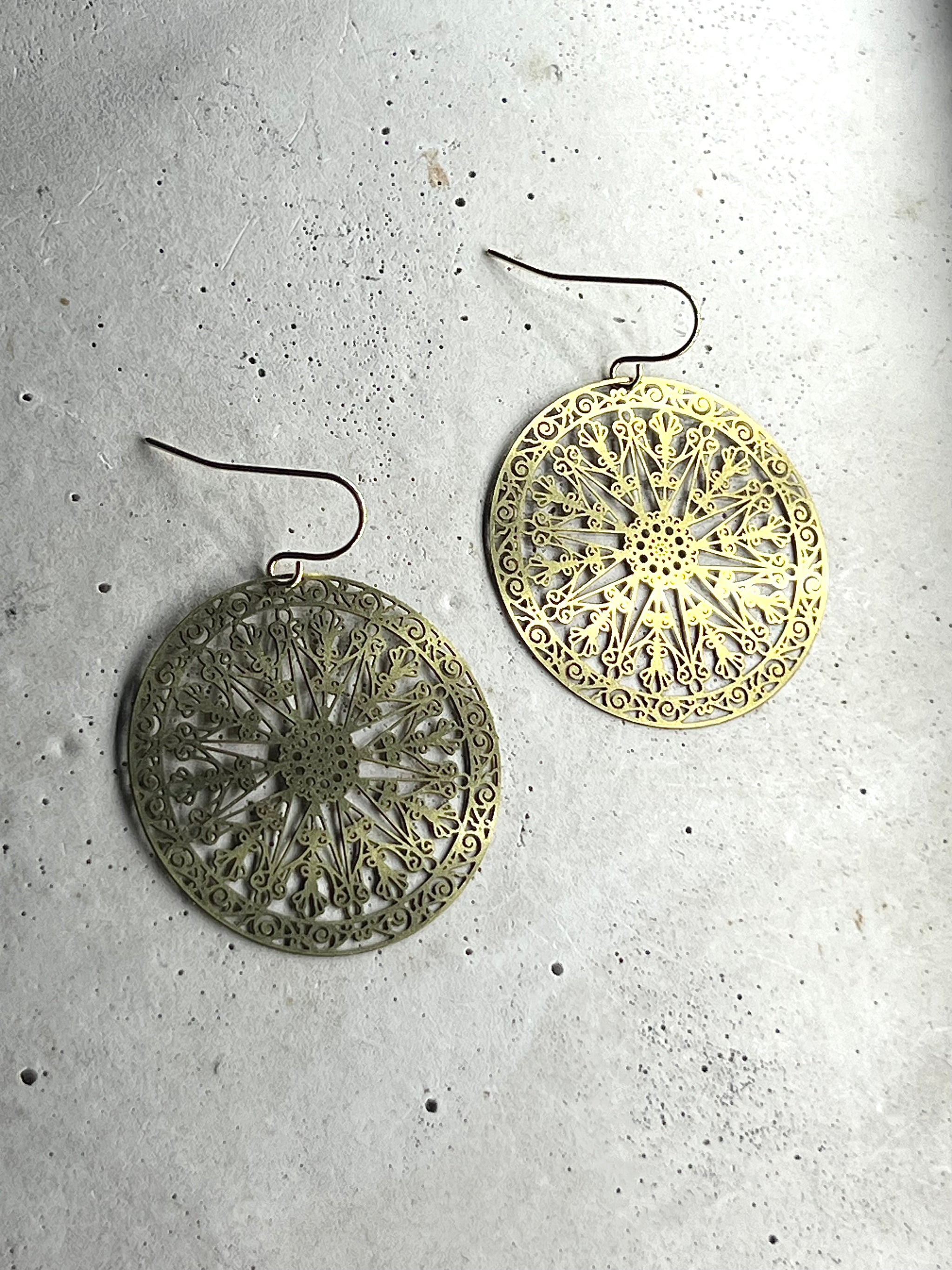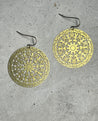 Sehr leichte kreisrunde Elemente mit extrem feinem, filigranem Mandala - Sonnen Muster. Die Elemente sind aus hochwertigem Messing angefertigt. Die Ohrhaken sind aus 14k vergoldetem recycled Silber angefertigt.