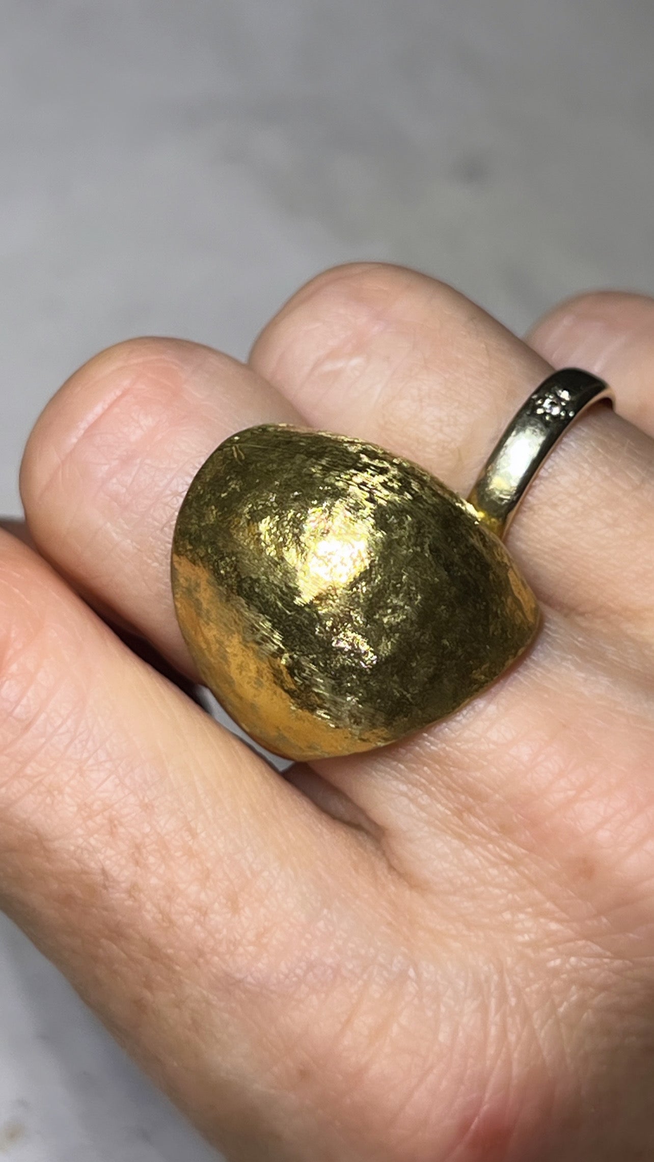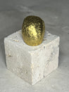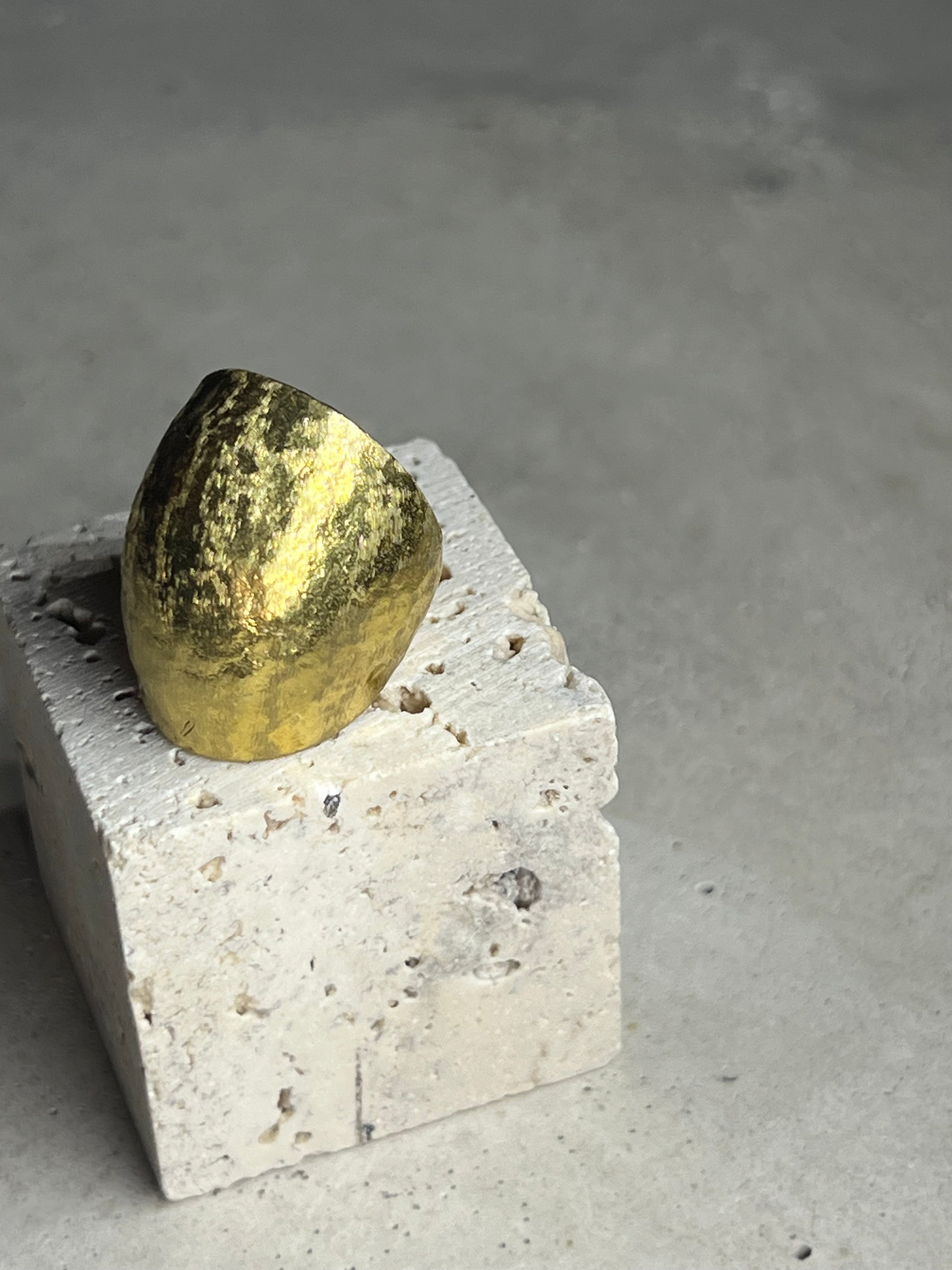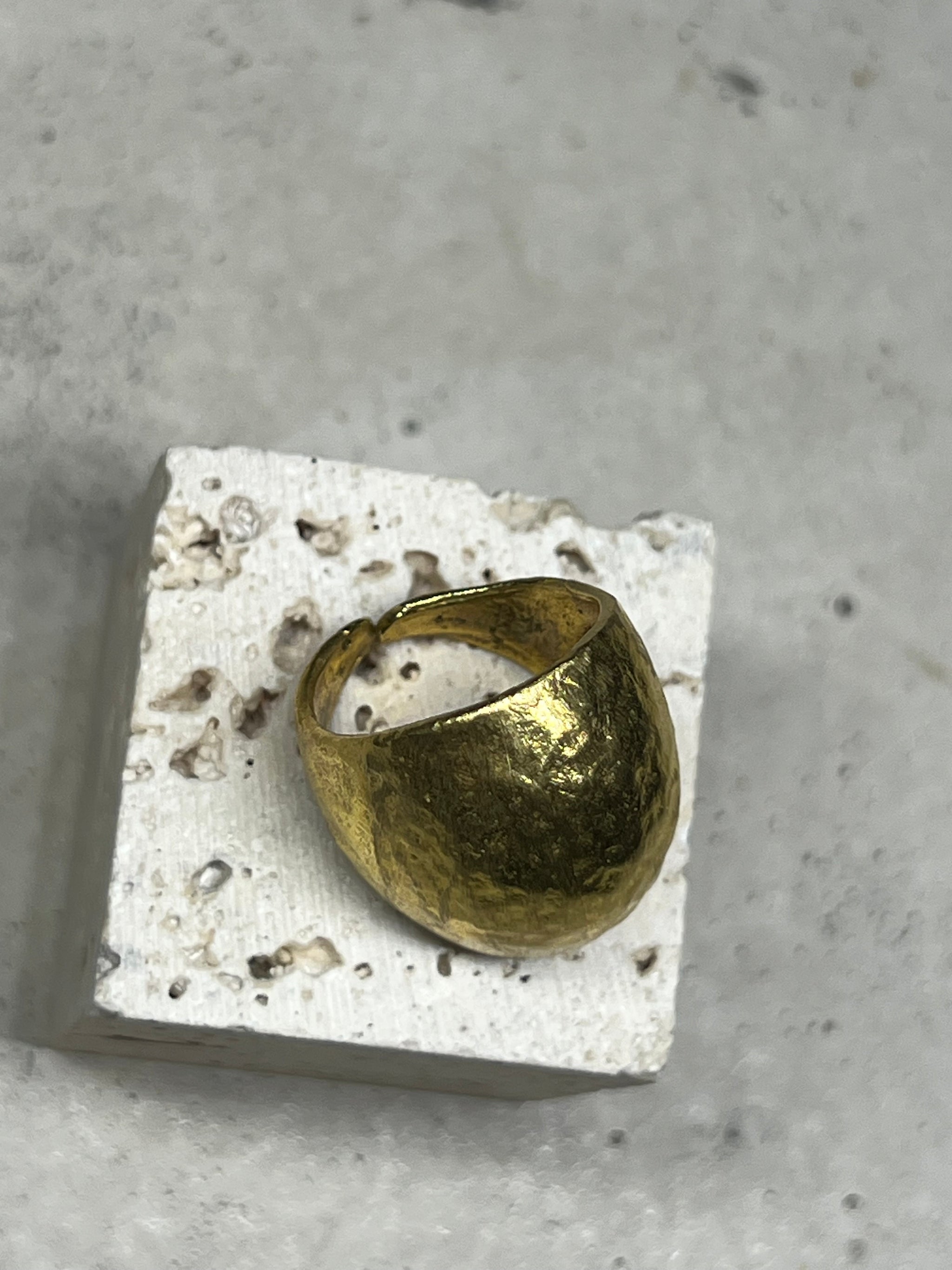 Massiver Ring in runder Kugelform, aus hochwertigem Messing gefertigt mit glänzender gehämmerter Oberfläche. Der Ring ist größenverstellbar.