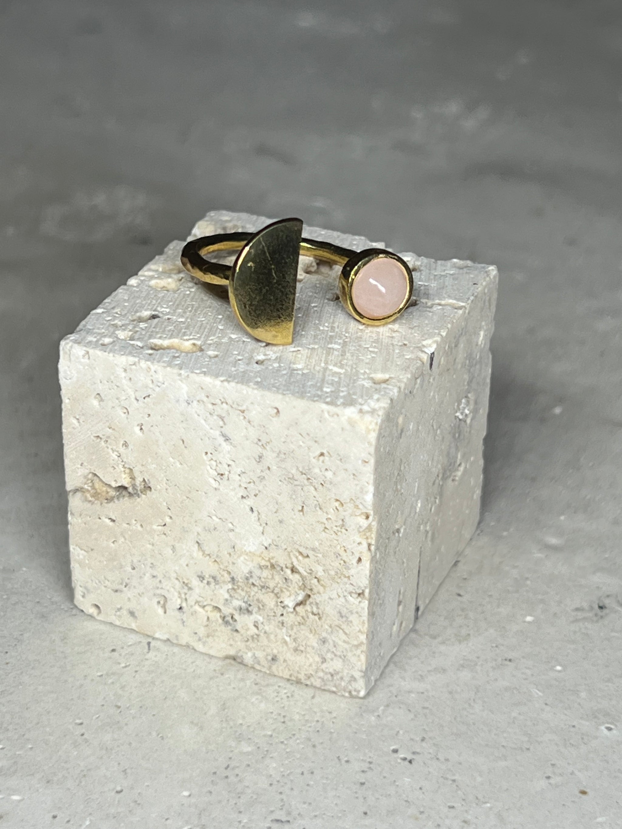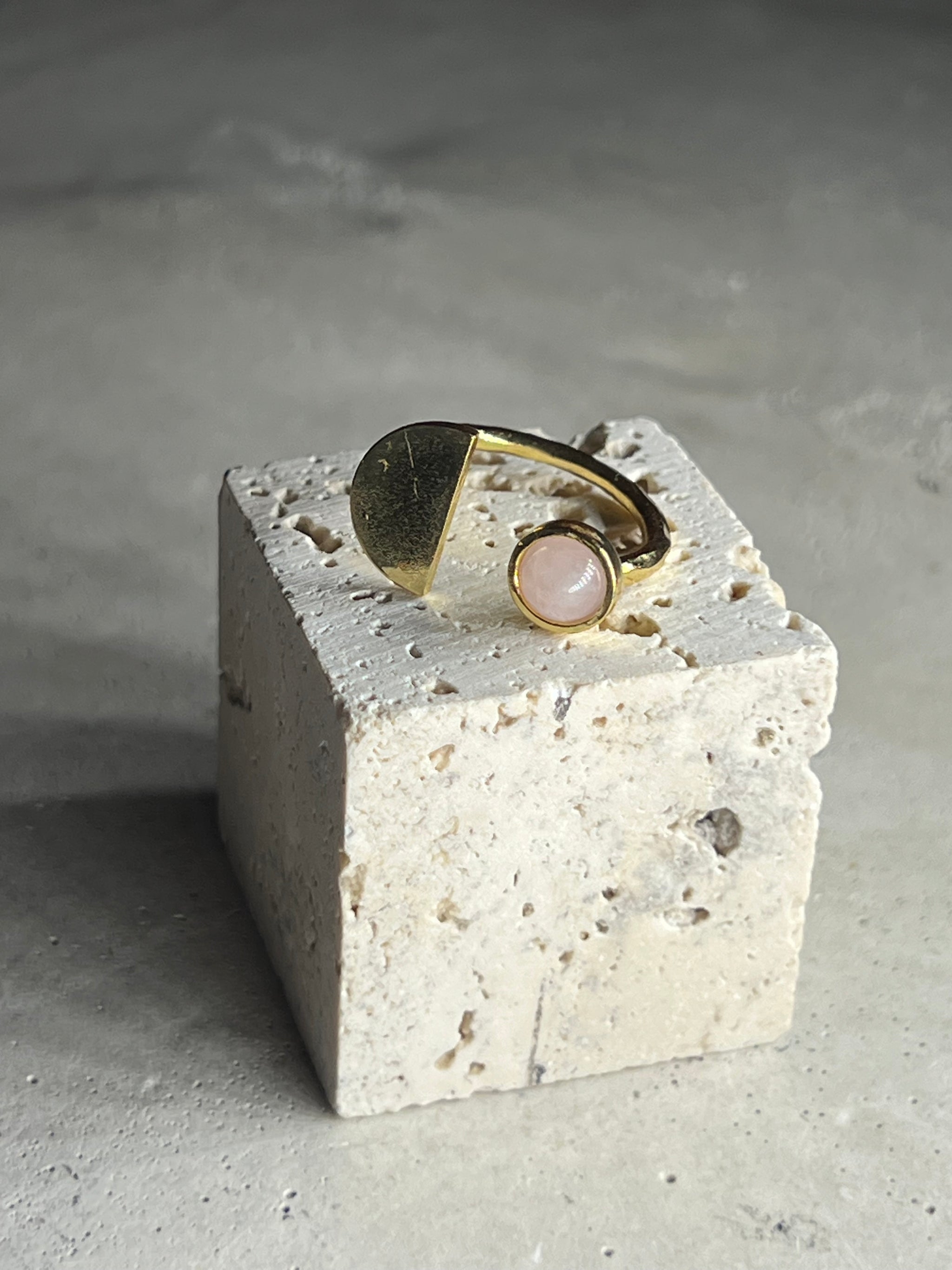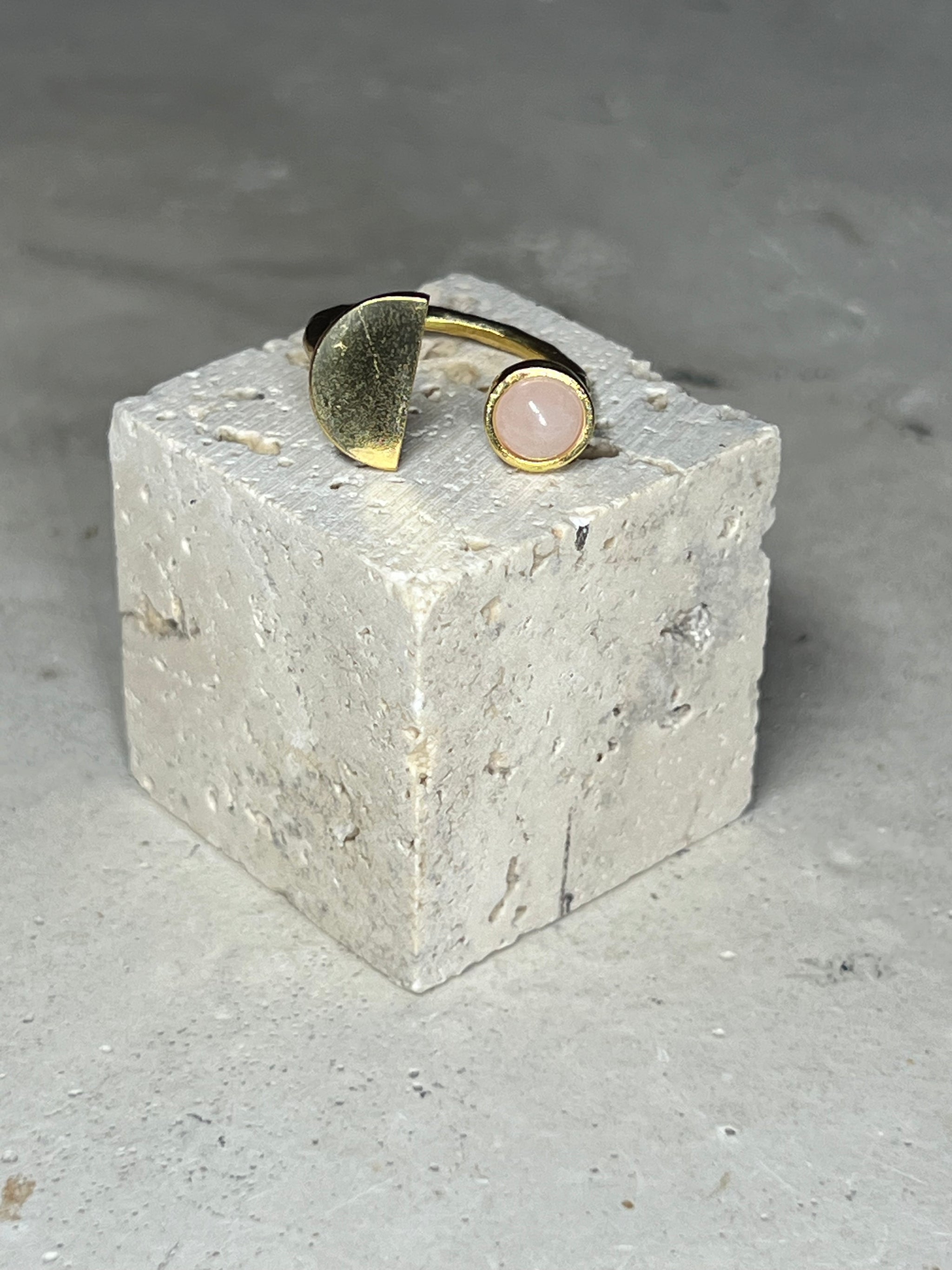 Mond Ring aus Edelstahl & zu 18k vergoldet. Eingefasst ist ein rosé farbener Rosenquarz in 5-6 mm Durchmesser. Der Ring ist nicht geschlossen und somit größenverstellbar.