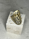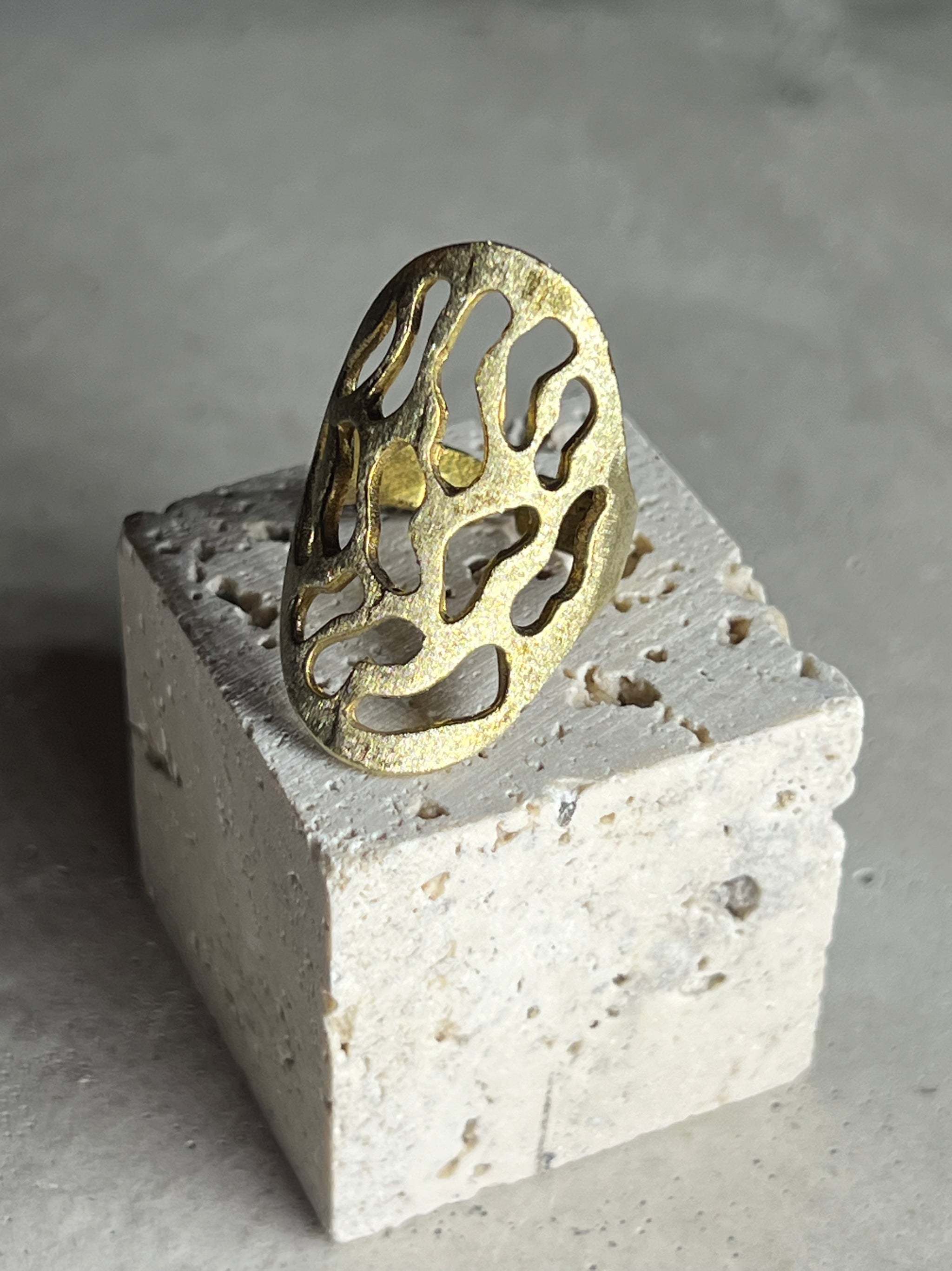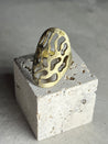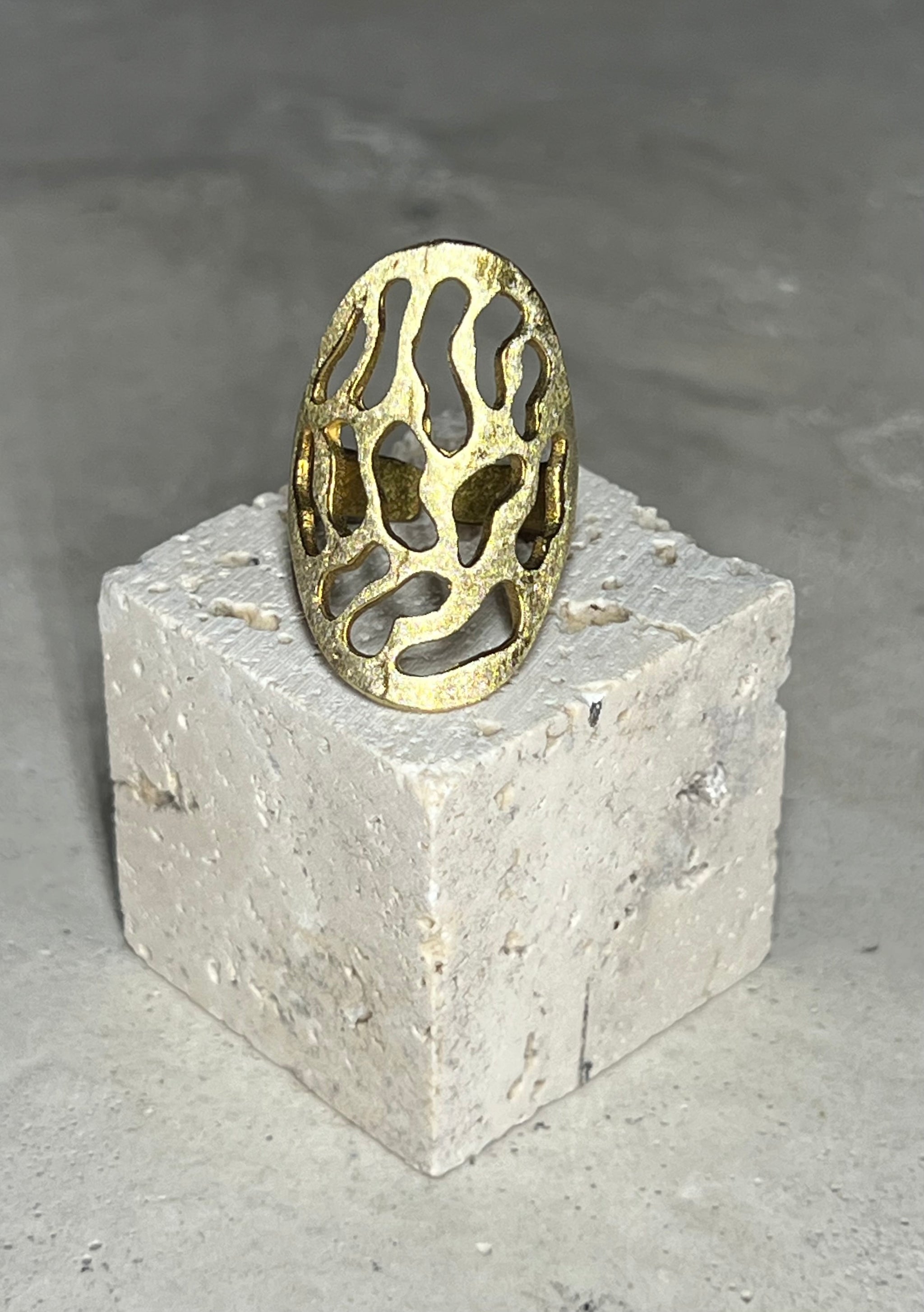 Massiver Messingring in Animal Print / Cut Out Design. Mit samtig, glänzend polierter feiner Oberflächenstruktur. Der Ring ist 3 cm hoch und die Form bis zu 2 cm breit.