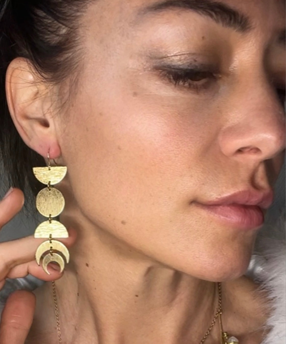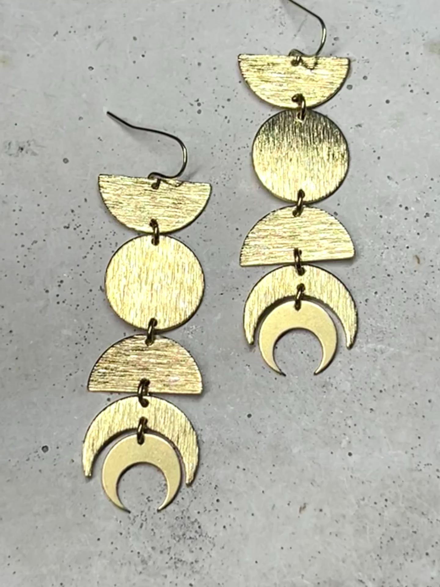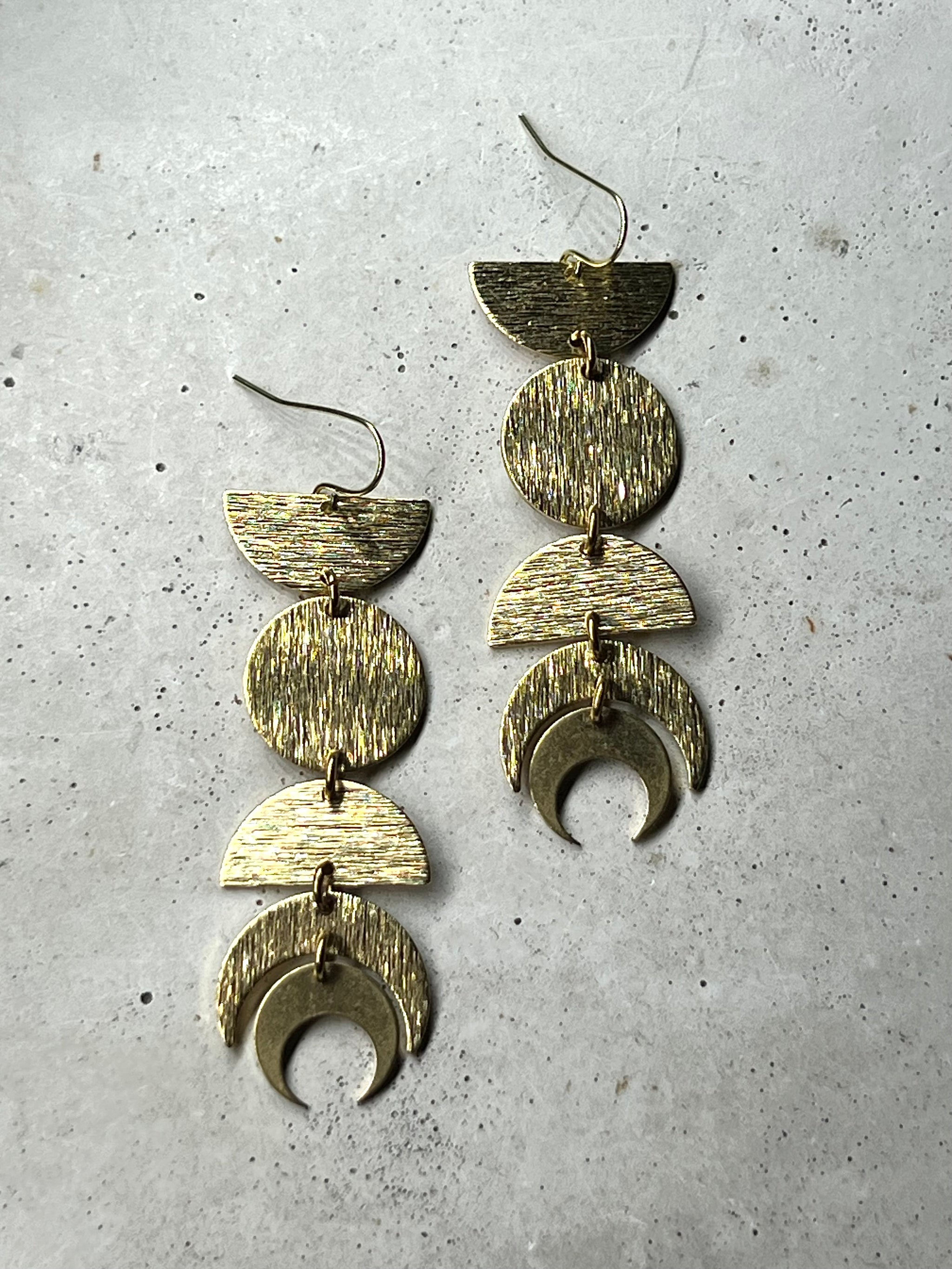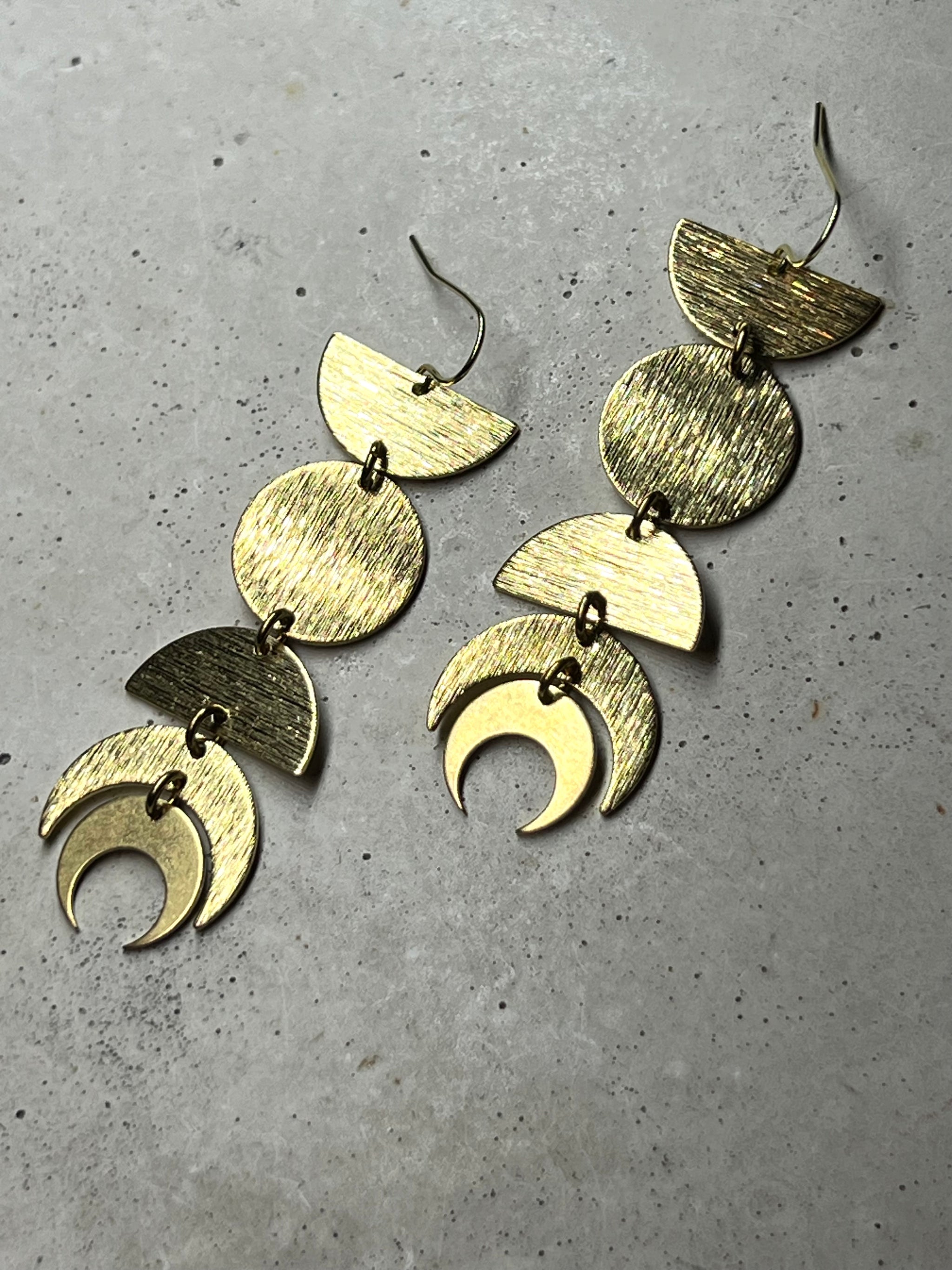 Sichelmonde, Halbmonde und Vollmonde aus hochwertigem Messing, mit glänzend strukturierter Oberflächen, zieren die zu 14k vergoldeten Ohrhaken.