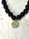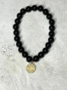 Handgefertigtes Edelsteinarmband mit Gummizug, bestehend aus 8mm schwarzen Onyx Perlen und einem Messinganhänger.