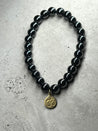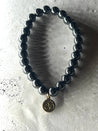 Handgefertigtes Edelsteinarmband mit Gummizug, bestehend aus 8mm anthrazitfarbenen Hämatit Perlen und einem Messinganhänger.