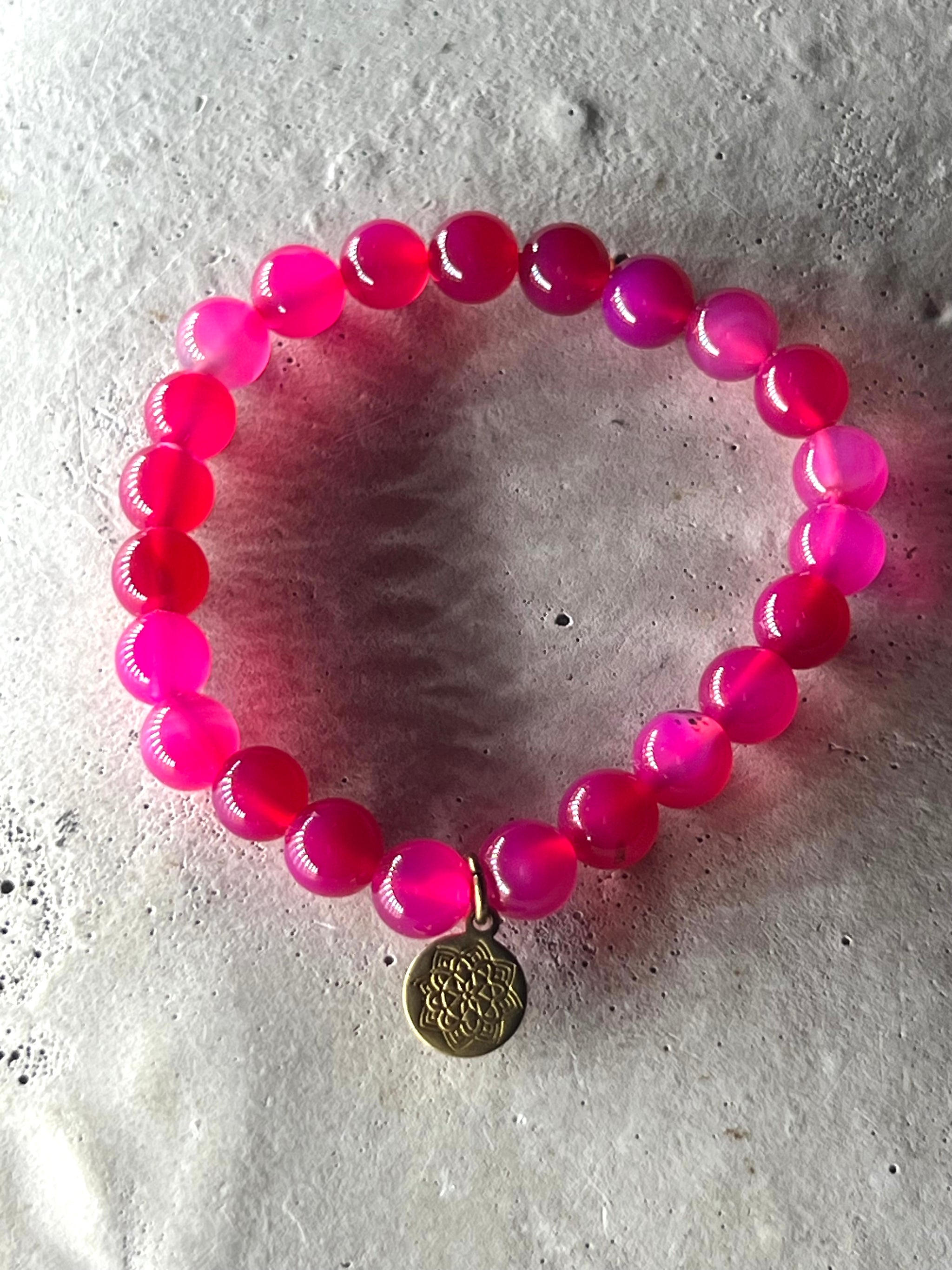 Handgefertigtes Edelsteinarmband mit Gummizug, bestehend aus 8mm pinken Achat Perlen und einem kreisrundem Messinganhänger.