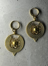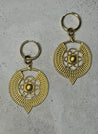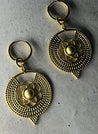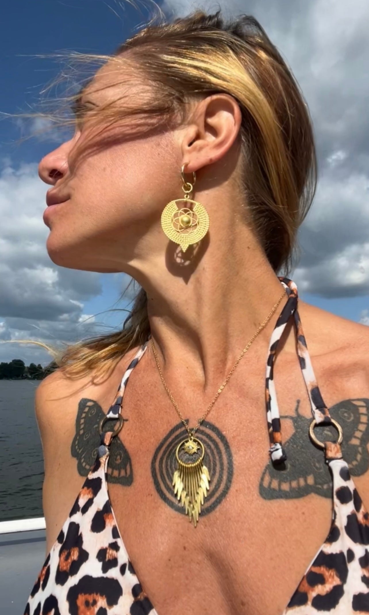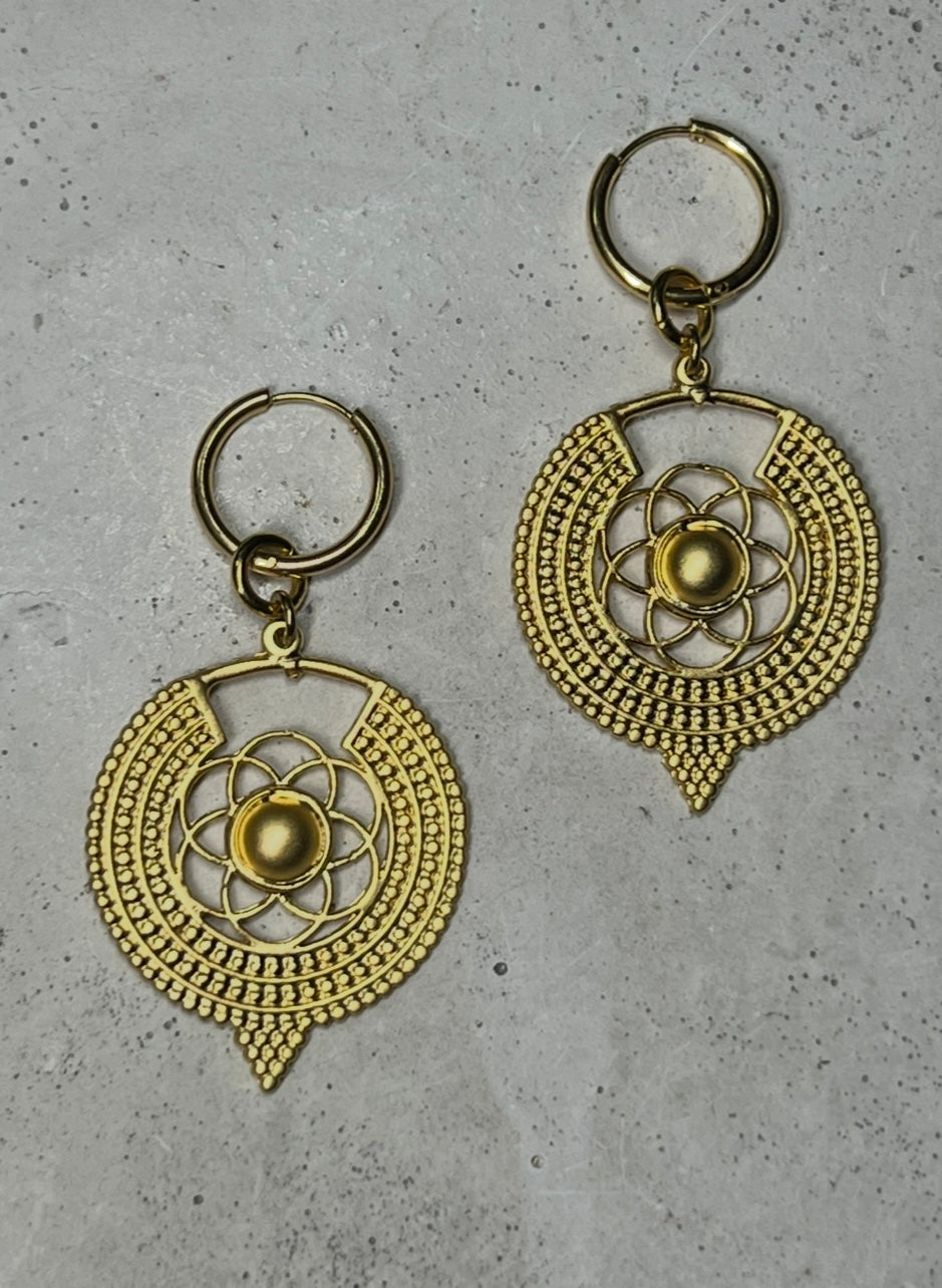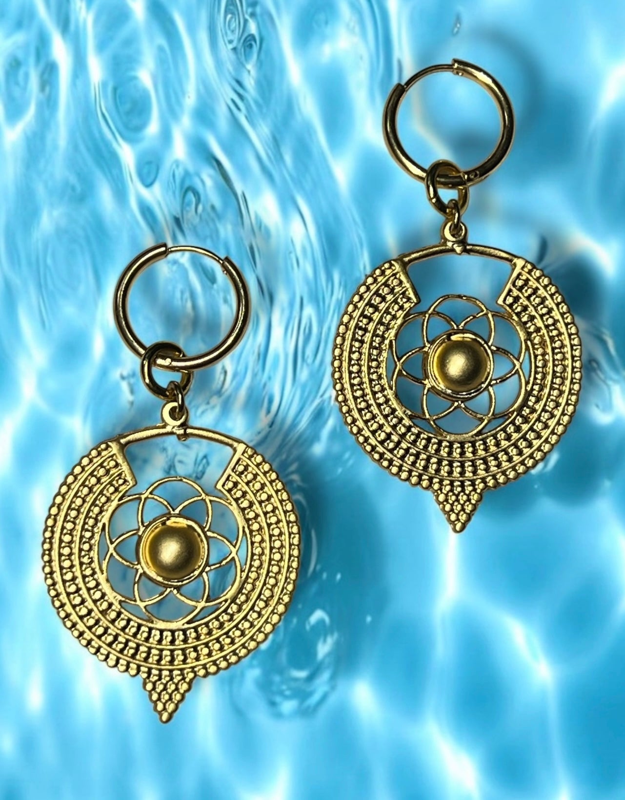 Messingohrringe zu 18k vergoldet mit ethnisch, geometrischem Anhänger im spirituell orientalischem Design. Der Anhänger hat eine Länge von 4,4 cm und eine Breite von 1,5 cm. Die massiven 18k vergoldeten Clipcreolen haben eine Stärke von 2mm und einen Durchmesser von von 1.5 cm.