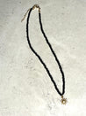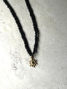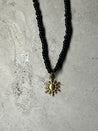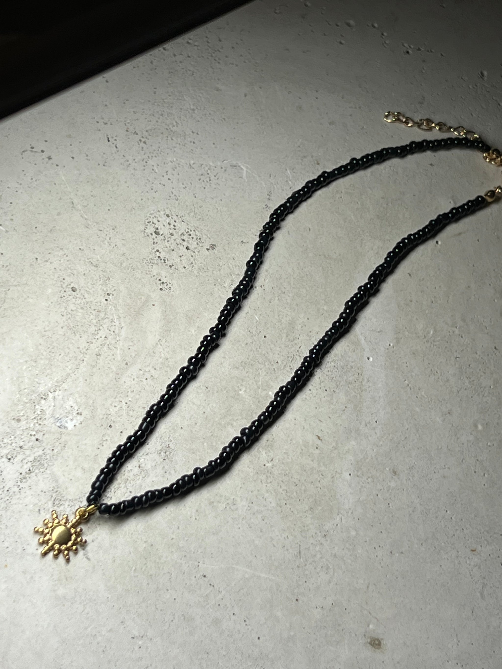 Perlenhalskette in 42,5 cm Länge mit aufgezogenen recycling Perlen. Der Sonnenanhänger ist aus 14k vergoldetem Edelstahl angefertigt.