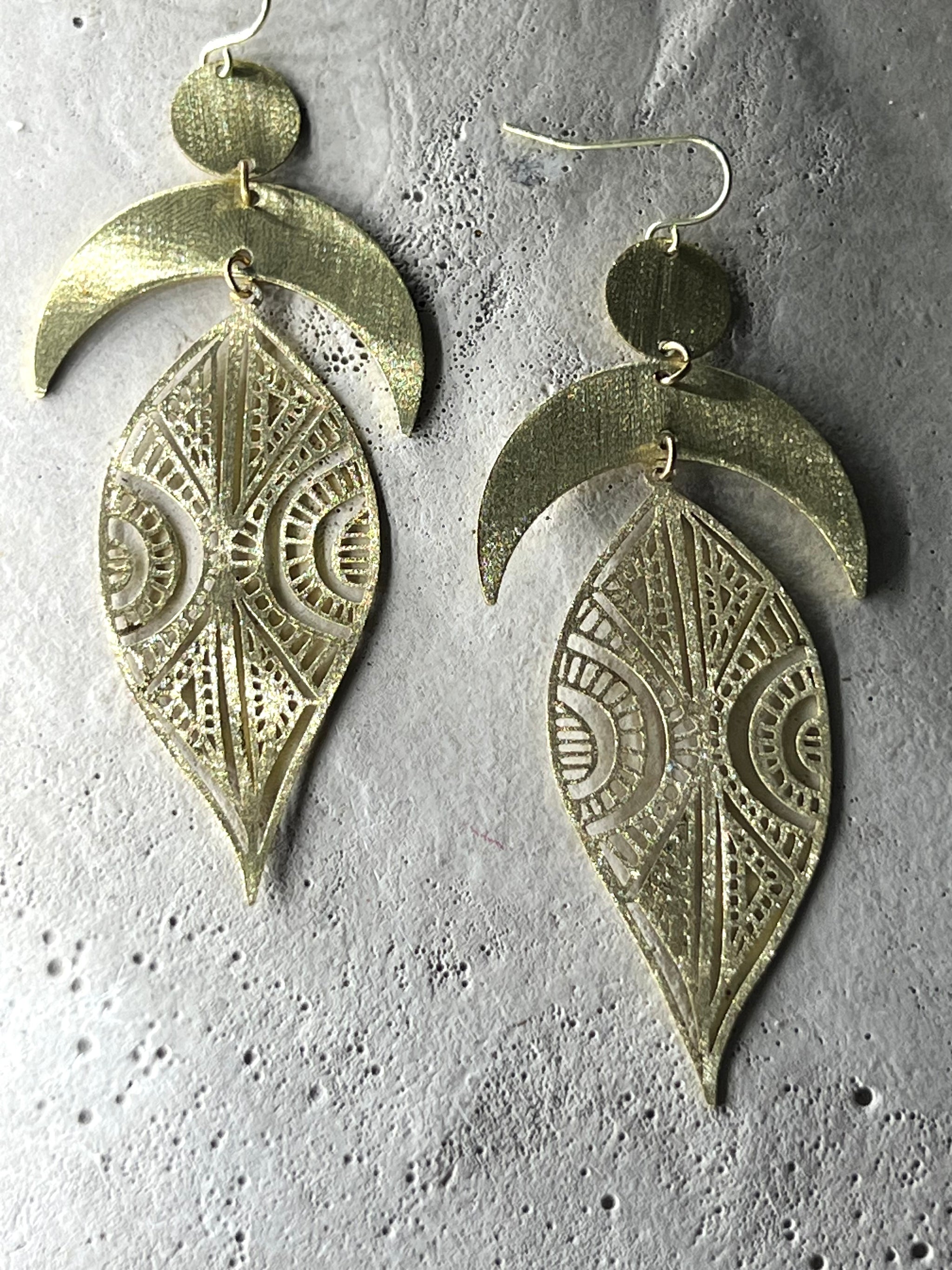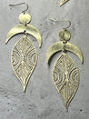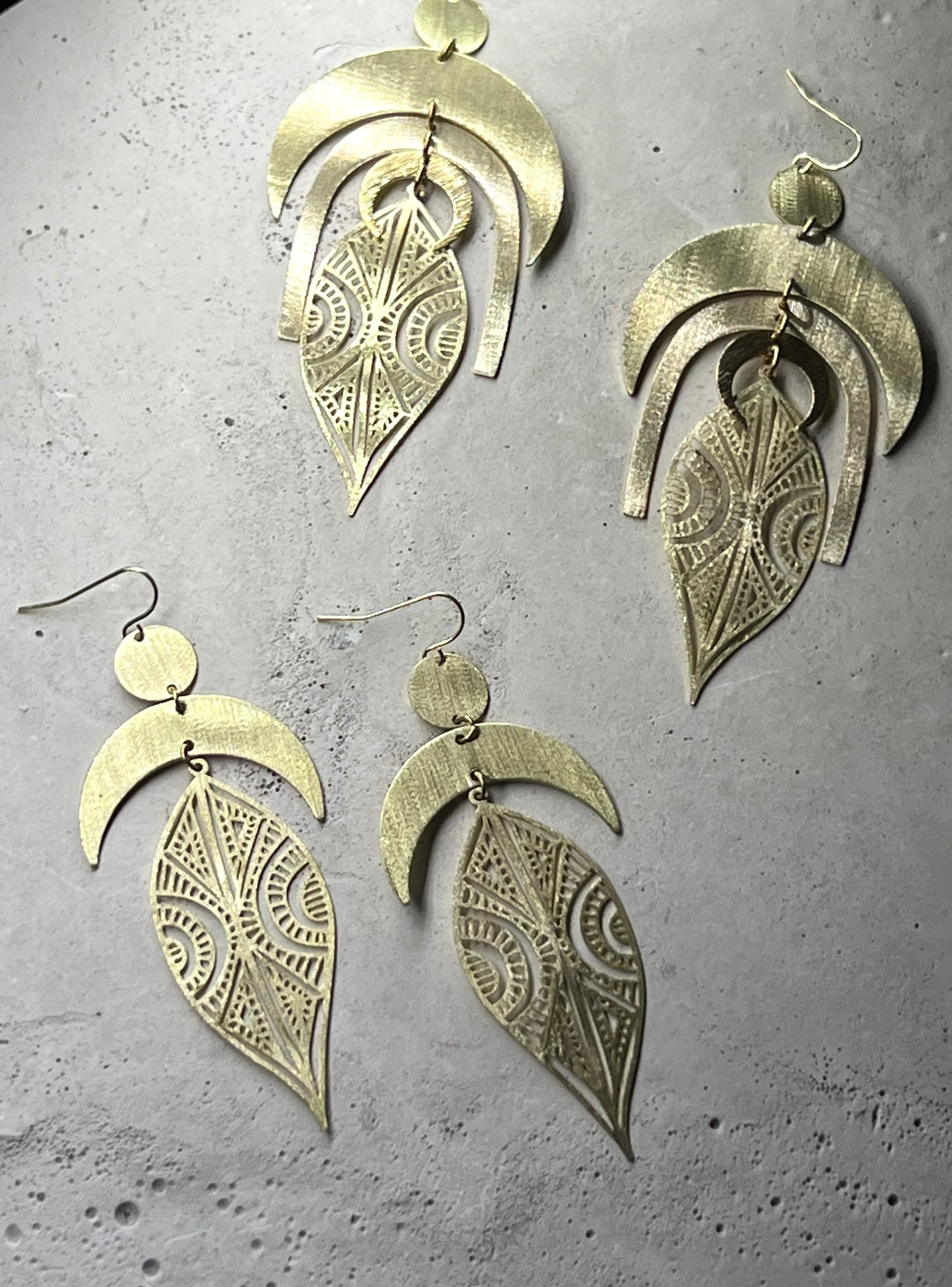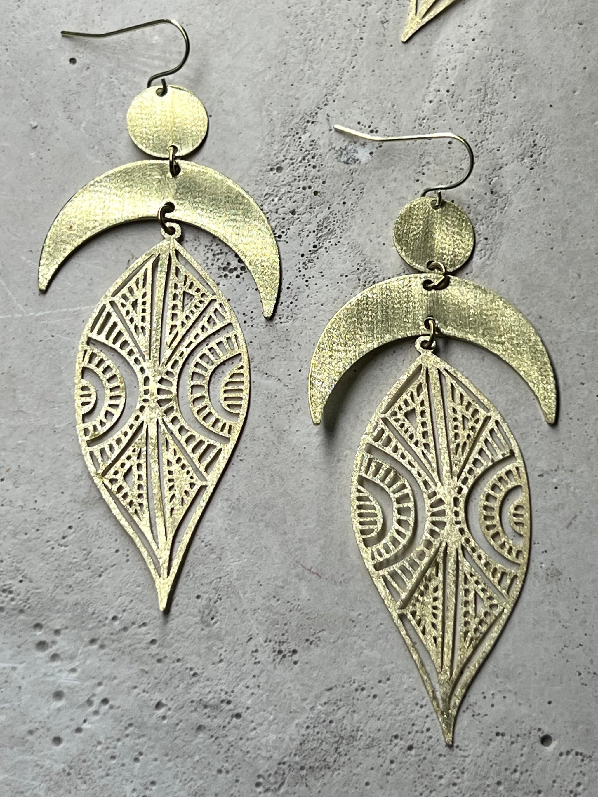 Ayokha Ohrringe aus fein poliertem Messing mit sachter Oberflächenstruktur in Bogenform mit Sichelmonden & filigranem Blatt. Dies ist die kleinere & etwas leichtere Version der original All My Million Moons, AYOKHA Ohrringe. Die Ohrhaken sind aus 14 k vergoldetem 925 recycling Silber / Eco Silber oder wahlweise mit Creolen zu 14k vergoldet aus dem Hauptmetall Edelstahl.
