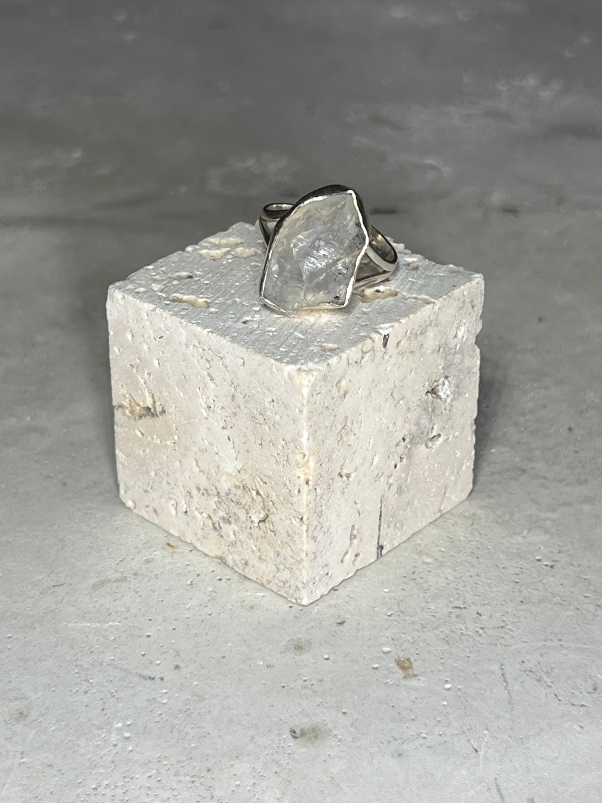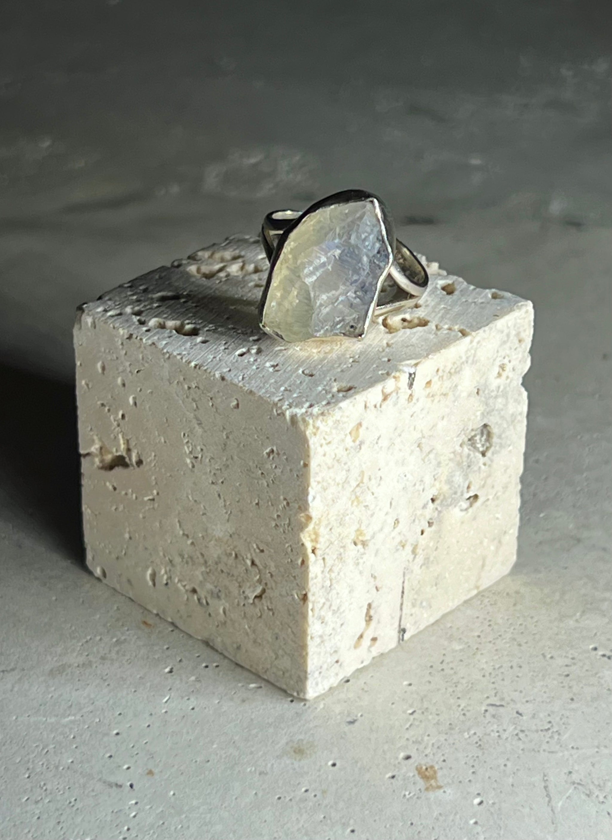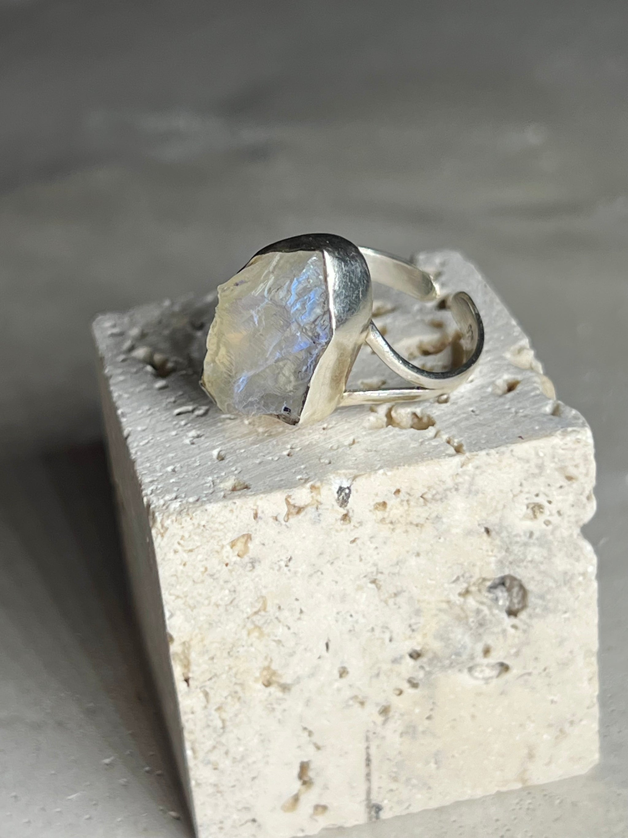 Echtsilber Ring mit rohem Mondstein. Die gesamte Ringfassung ist aus 925 recycled Silber angefertigt. Der Mondstein ist in seiner rohen Edelsteinform an die Silberfassung adaptiert und eingearbeitet worden.